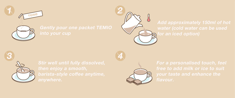 Designed for dynamic lifestyles, Temio’s coffee sachets offer precise portions of premium freeze-dried coffee, delivering consistent freshness without equipment—just add hot water and stir. Lightweight, compact, and effortlessly portable, they’re perfect whether you’re at work, traveling, outdoors, or enjoying a quick brew at home, bringing barista-quality coffee within reach anytime, anywhere.