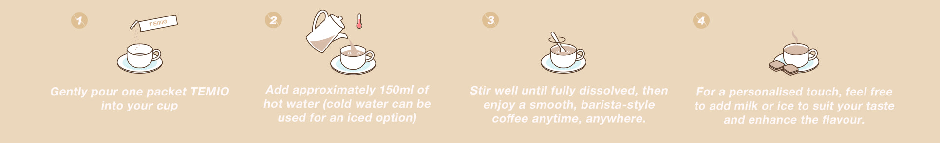 Unlike regular instant coffee, which often loses depth and aroma during high-heat processing, Temio’s freeze-dried technology locks in the rich, full-bodied flavour of freshly brewed coffee. The result? A smooth, strong, and well-rounded cup that dissolves instantly—without the compromise.